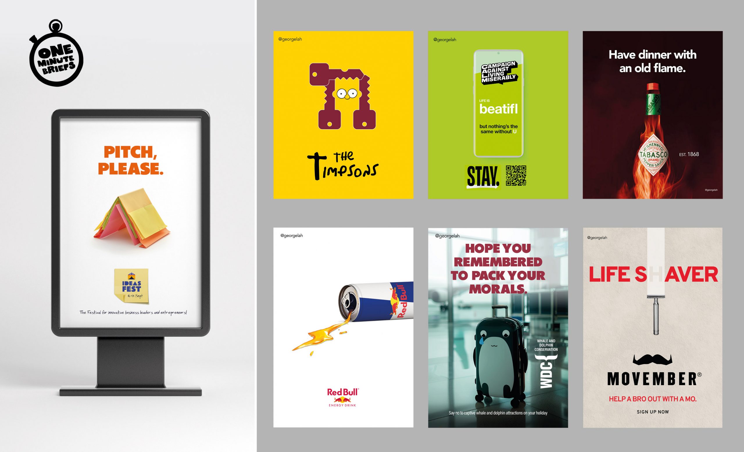 Above all else, I pride myself on being a conceptual creative. I am an OMBassador for One Minute Briefs, ‘The Quick-Thinking Creative Community’. OMB challenge creatives of all kinds to respond with instinctive ideas to daily advertising briefs via Twitter (X).